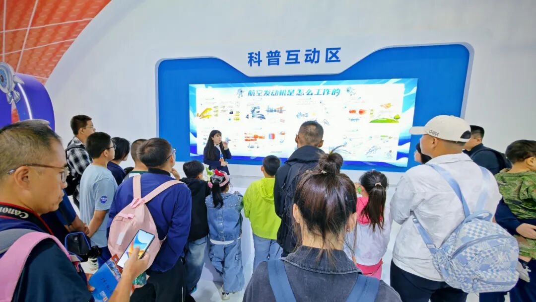 展台现场还专门设置了科普互动区,工作人员通过“讲解+互动”的形式,让青少年了解更多的航空发动机知识,在他们心中播种逐梦蓝天的种子。